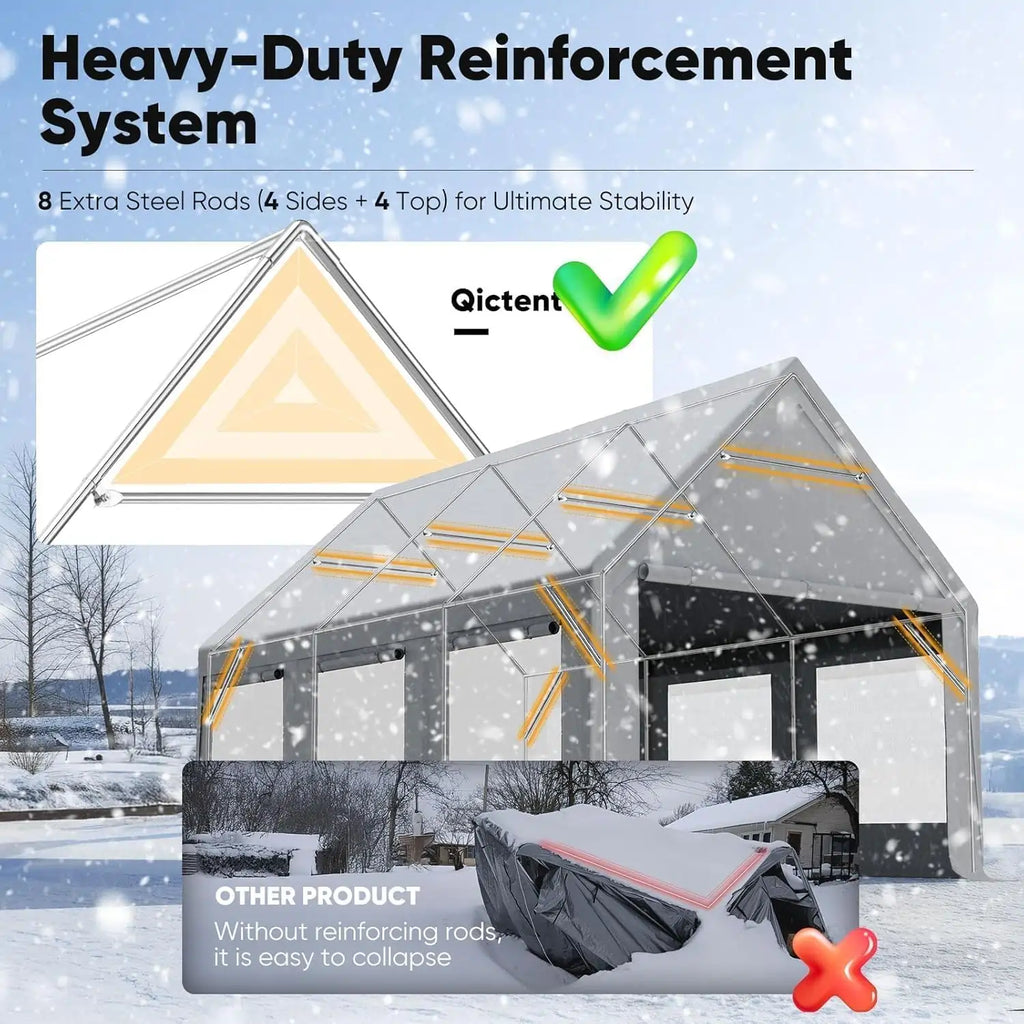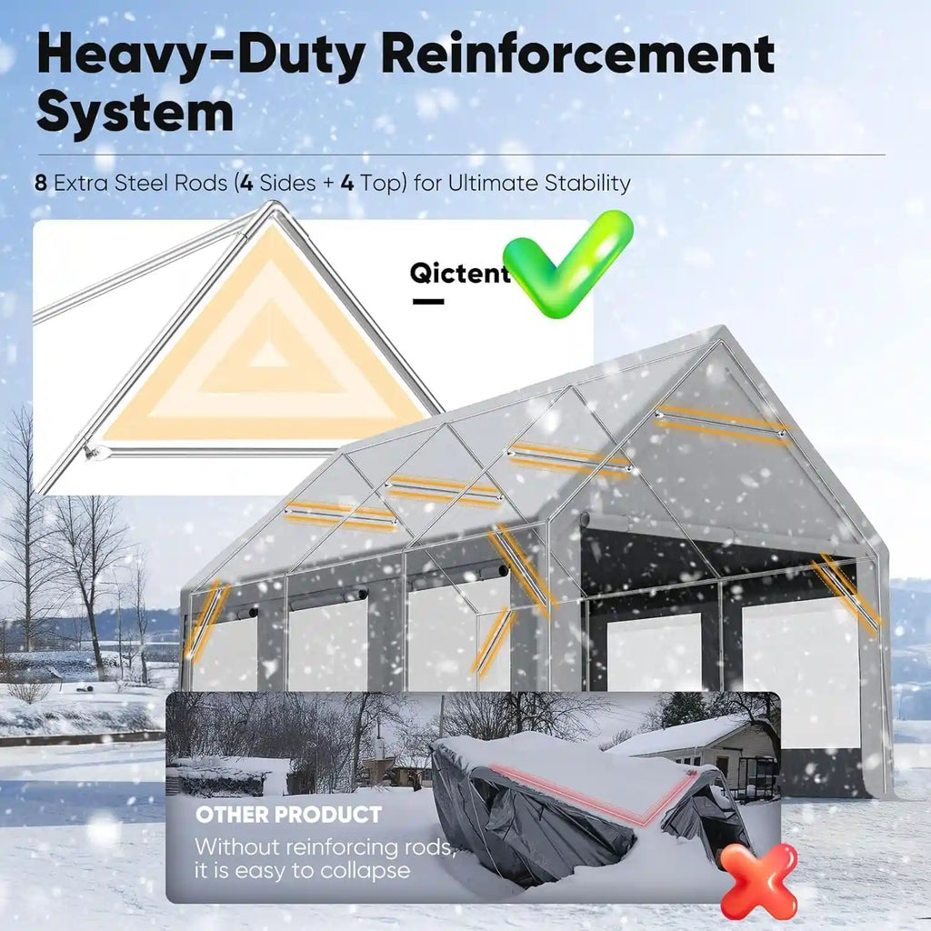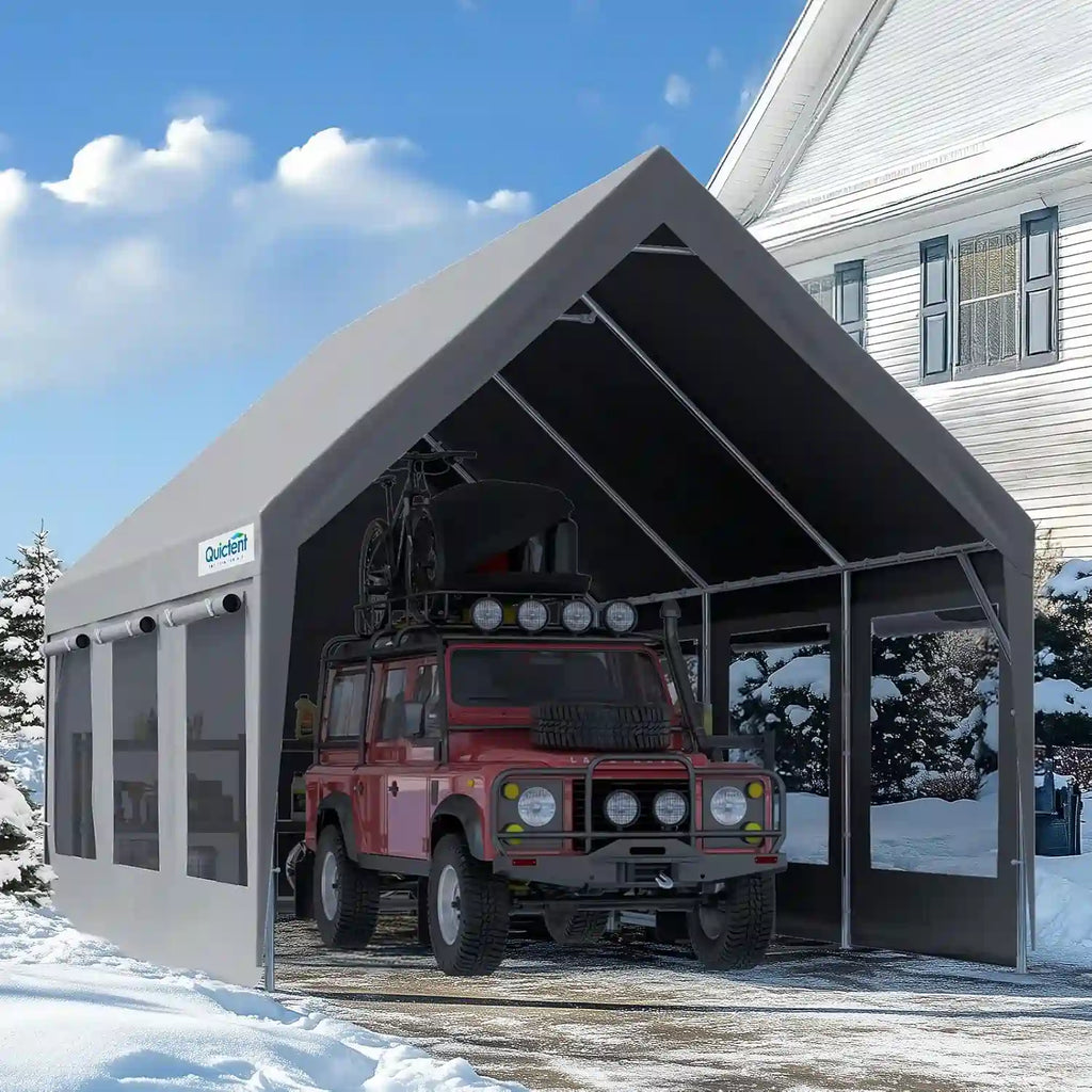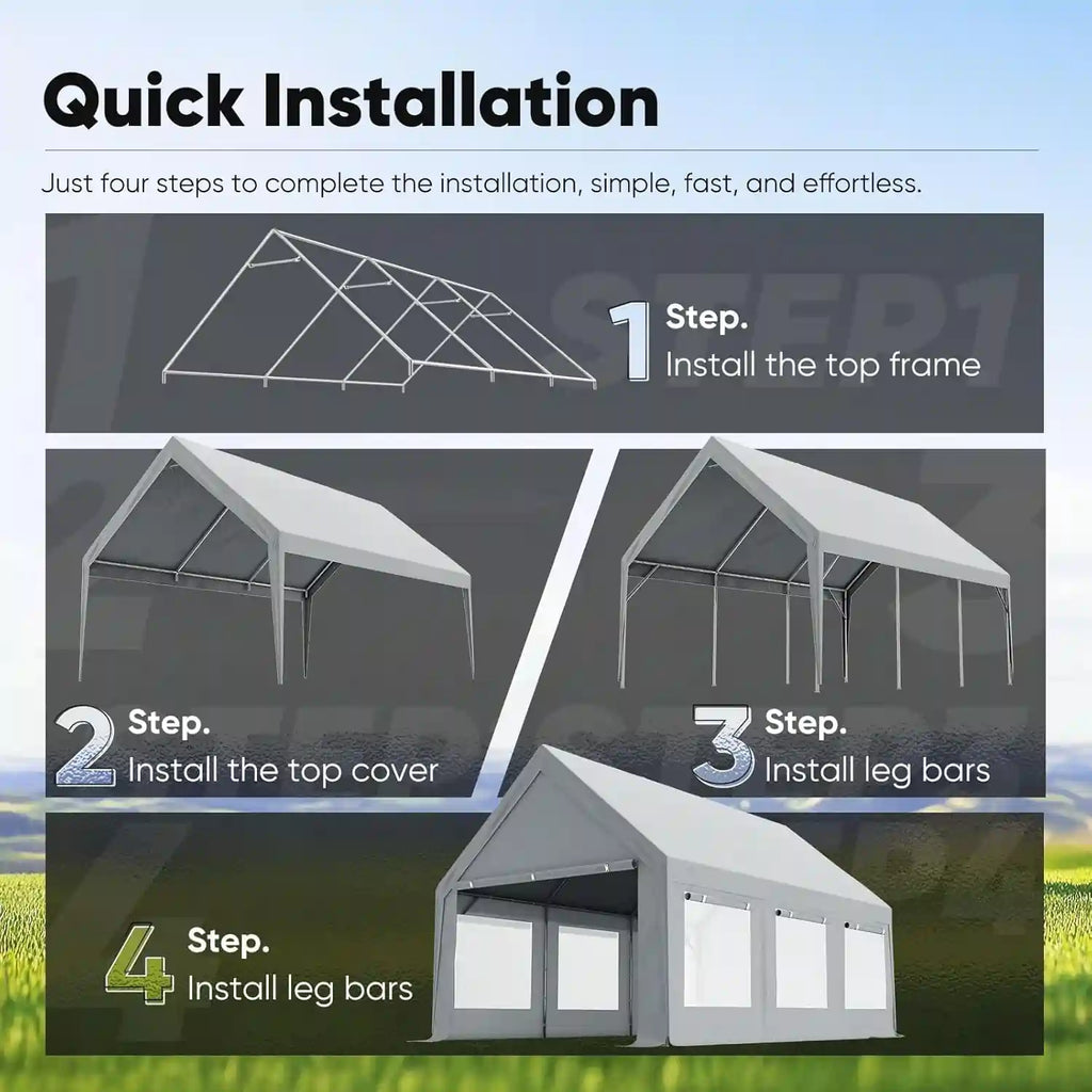 This carport is designed for temporary use only. For safety and product longevity, please do not leave it installed outdoors as a permanent structure. Do not use this shelter during extreme weather conditions such as tornadoes, hurricanes, or heavy snowstorms. For enhanced stability, it is recommended to secure the structure using both the provided ground pegs and ropes.